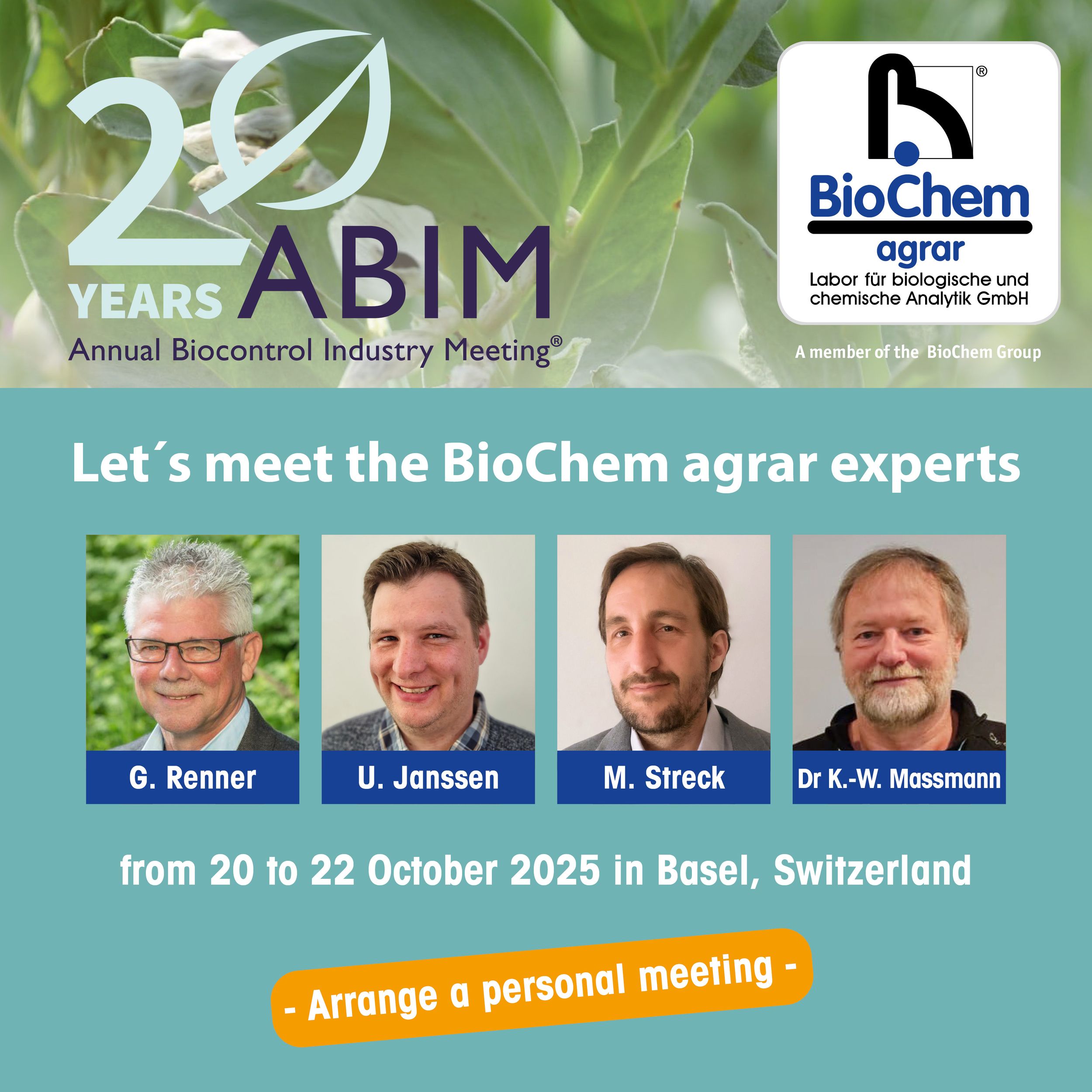 Treffen Sie unsere BioChem agrar Experten vom 20. bis 22. Oktober 2025 auf der ABIM (Annual Biocontrol Industry Meeting) in Basel.